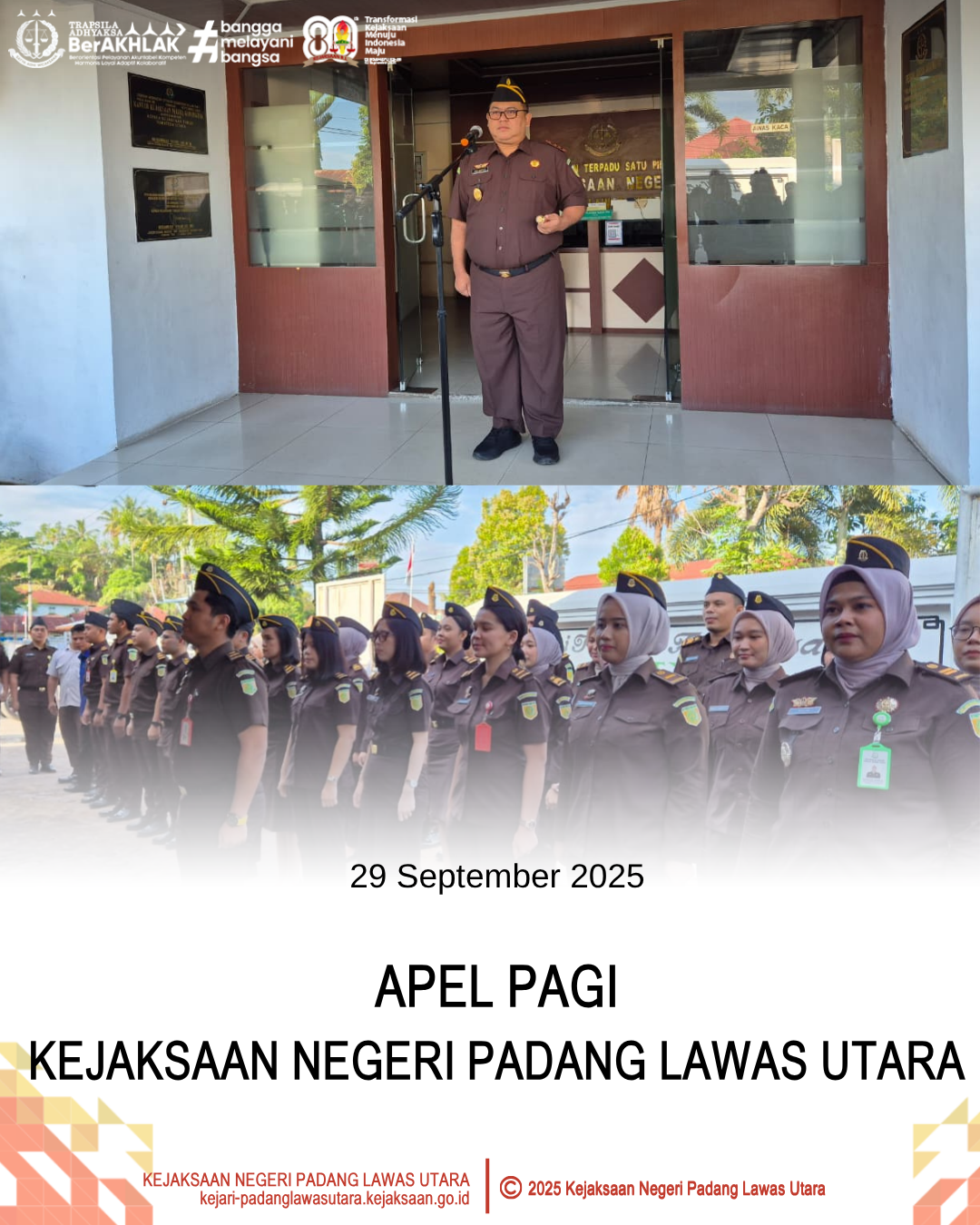 Senin, 29 September 2025 pada pukul 08.00 WIB s/d selesai, Telah dilaksanakan Kegiatan Apel Pagi bertempat di Halaman Kantor Kejaksaan Negeri Padang Lawas Utara.
