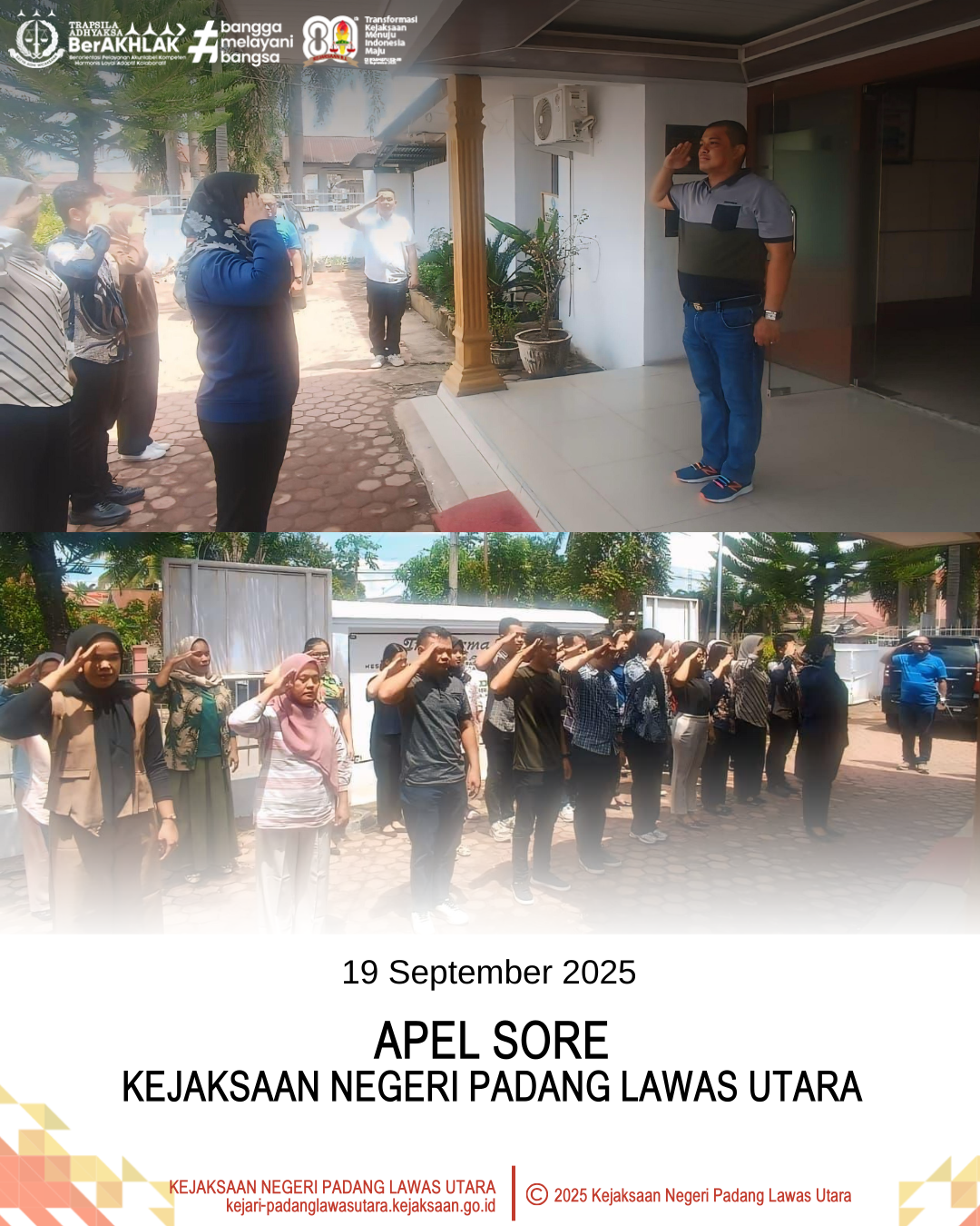 Bertempat di Halaman Kantor Kejaksaan Negeri Padang Lawas Utara, telah dilaksanakan Apel Sore yang dipimpin oleh Kepala Seksi Pengelolaan Barang Bukti dan Barang Rampasan, Bapak MP Marcos Octavianus, S.H., dan diikuti oleh seluruh pegawai Kejaksaan Negeri Padang Lawas Utara.