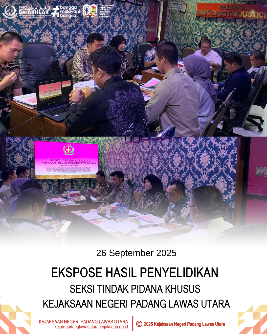 bertempat di Aula Kantor Kejaksaan Negeri Padang Lawas Utara, telah dilaksanakan Ekspose Hasil Penyelidikan Seksi Tindak Pidana Khusus.