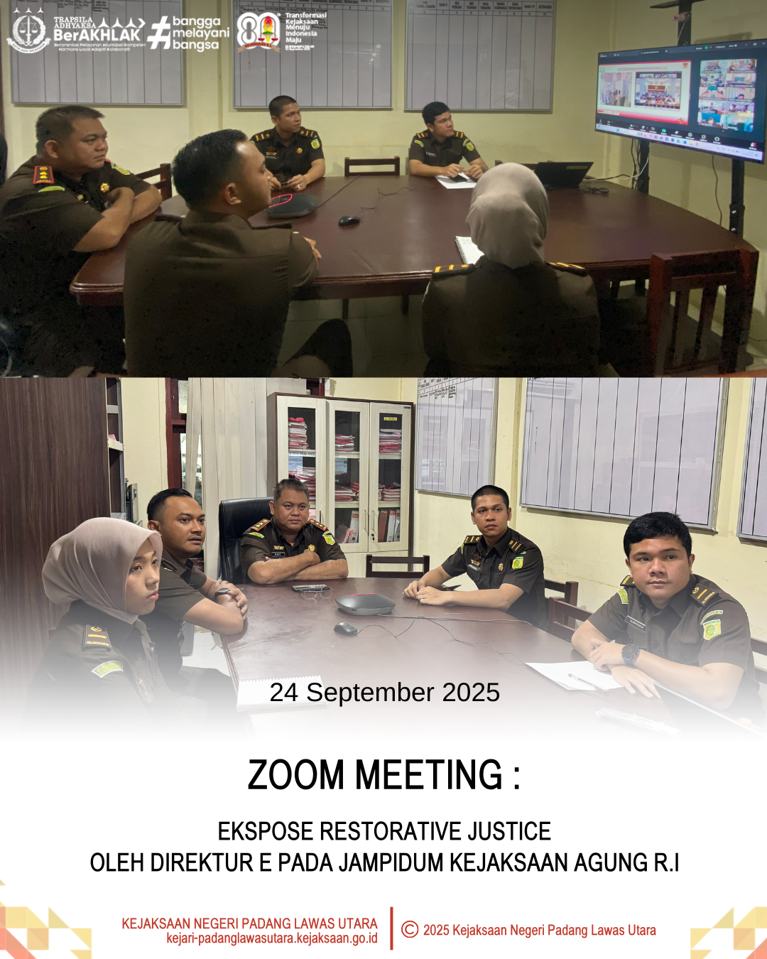 Rabu, 24 September 2025 sekira pukul 09.00 WIB s/d selesai, bertempat di Kantor Kejaksaan Negeri Padang Lawas Utara, telah dilaksanakan Ekspose RJ oleh Direktur E pada Jampidum Kejaksaan Agung R.I secara virtual melalui Zoom Meeting.