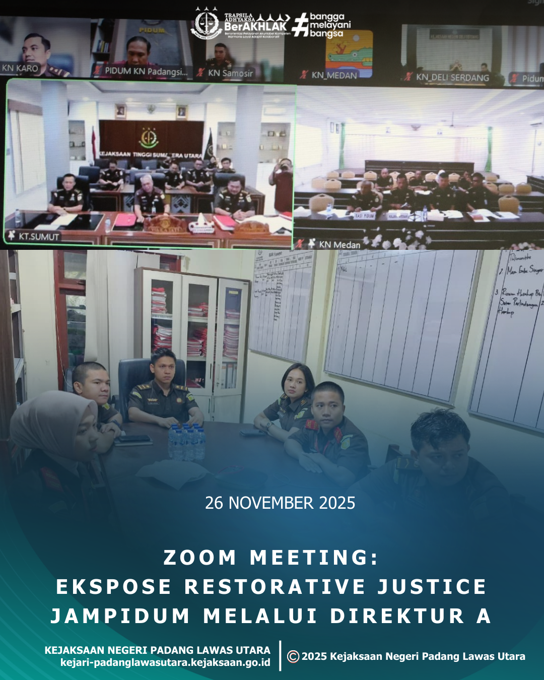 Rabu, 26 November 2025, bertempat di Ruang Kerja Seksi Tindak Pidana Umum, telah dilaksanakan kegiatan Ekspose Restorative Justice (RJ) oleh Direktur A pada JAM PIDUM Kejaksaan Agung RI secara online melalui aplikasi Zoom Meeting, diikuti oleh Kepala Seksi Tindak Pidana Umum, Bapak Juanda Fadli, S.H., M.H. yang diwakili oleh Hasbi Hamid Ansori, S.H. dan Delila Sihotang, S.H. selaku Jaksa Fungsional, beserta staf pada Seksi Tindak Pidana Umum Kejaksaan Negeri Padang Lawas Utara.