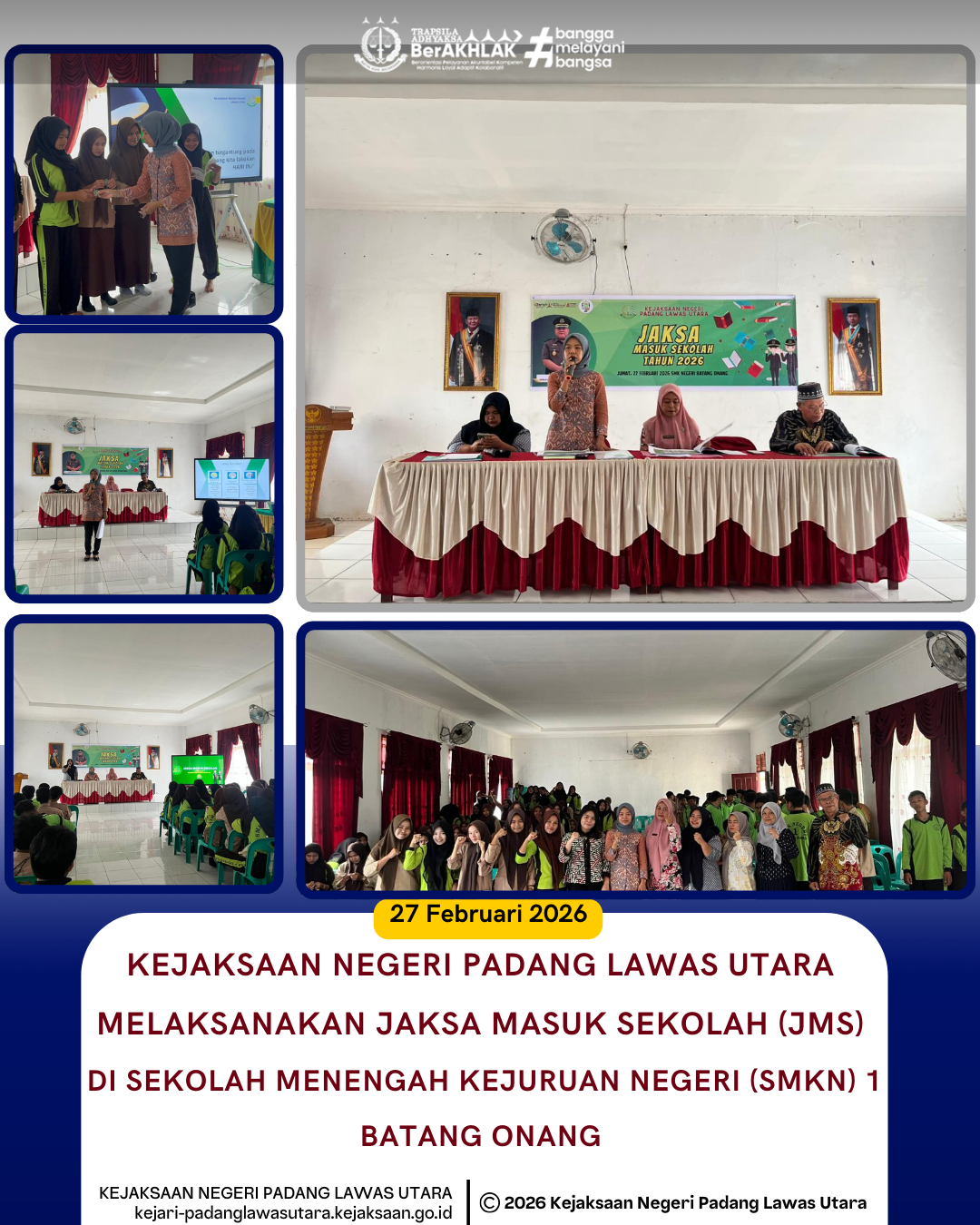 Kamis, 26 Februari 2026, Kepala Kejaksaan Negeri Padang Lawas Utara, Bapak Dadi Wahyudi, S.H., M.H, melalui Kepala Seksi Intelijen, Bapak Pahala Eric Silvandro, S.H., yang diwakili oleh Kasubsi II Seksi Intelijen, Ibu Yunita Pasaribu, S.H beserta Personil Seksi Intelijen melaksanakan kegiatan Jaksa Masuk Sekolah di SMK Negeri 1 Batang Onang, Kabupaten Padang Lawas Utara.