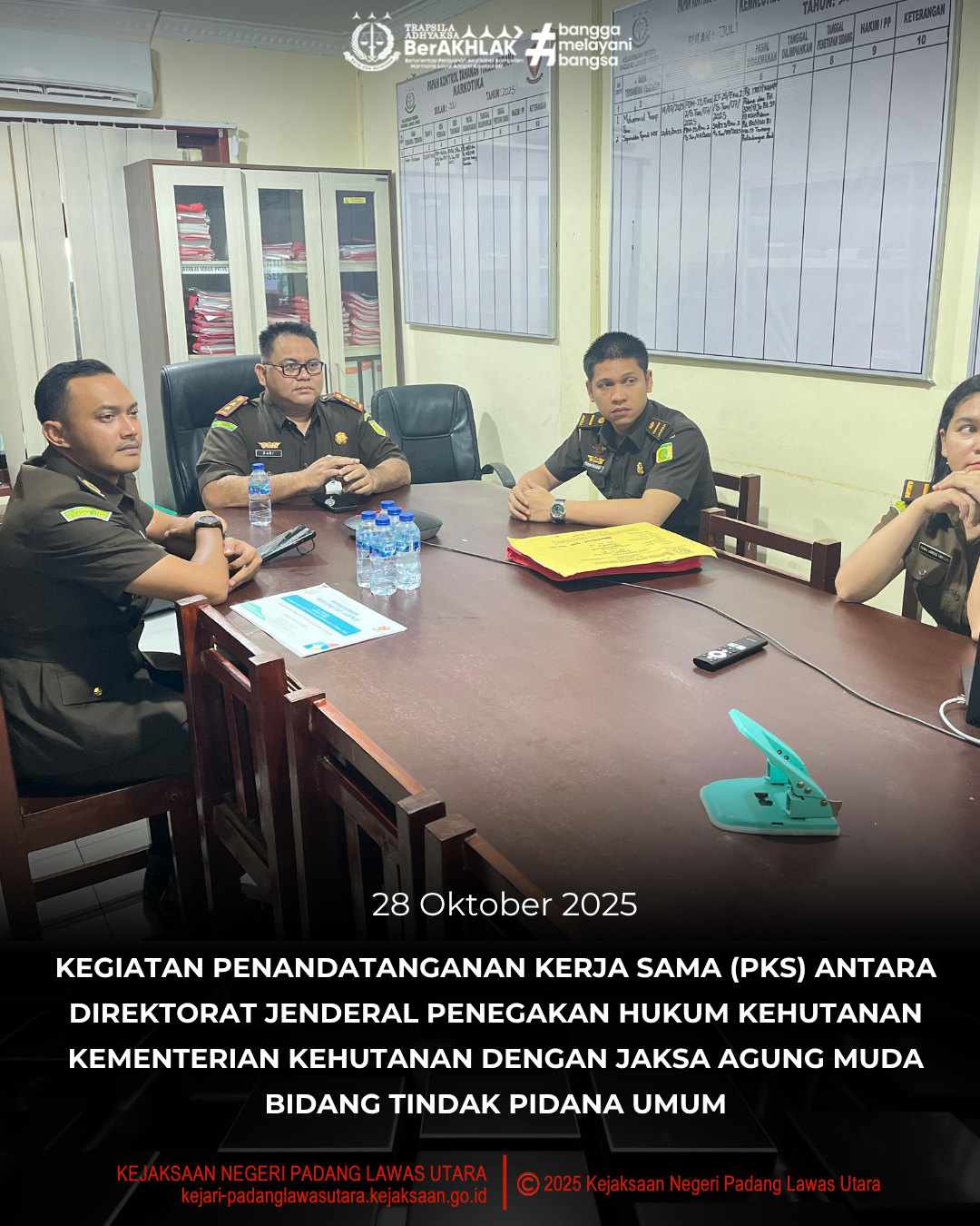 Pada hari Selasa, tanggal 28 Oktober 2025 sekira pukul 09.00 Wib s/d selesai, bertempat di Kantor Kejaksaan Negeri Padang Lawas Utara telah dilaksanakan Kegiatan Penandatanganan Kerja Sama (PKS) antara Direktorat Jenderal Penegakan Hukum Kehutanan Kementerian Kehutanan dengan Jaksa Agung Muda Bidang Tindak Pidana Umum.