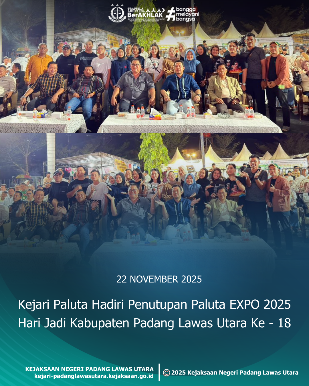 Sabtu, 22 November 2025, bertempat di Lapangan Gedung Serbaguna Paranginan, Kepala Kejaksaan Negeri Padang Lawas Utara, Bapak Dadi Wahyudi, S.H., M.H., beserta jajaran menghadiri secara langsung acara puncak dan penutupan PALUTA EXPO yang turut dihadiri oleh Bupati Padang Lawas Utara, Bapak H. Reski Basyah Harahap, serta tamu undangan lainnya dalam rangka memperingati Hari Jadi ke-18 Kabupaten Padang Lawas Utara Tahun 2025.
