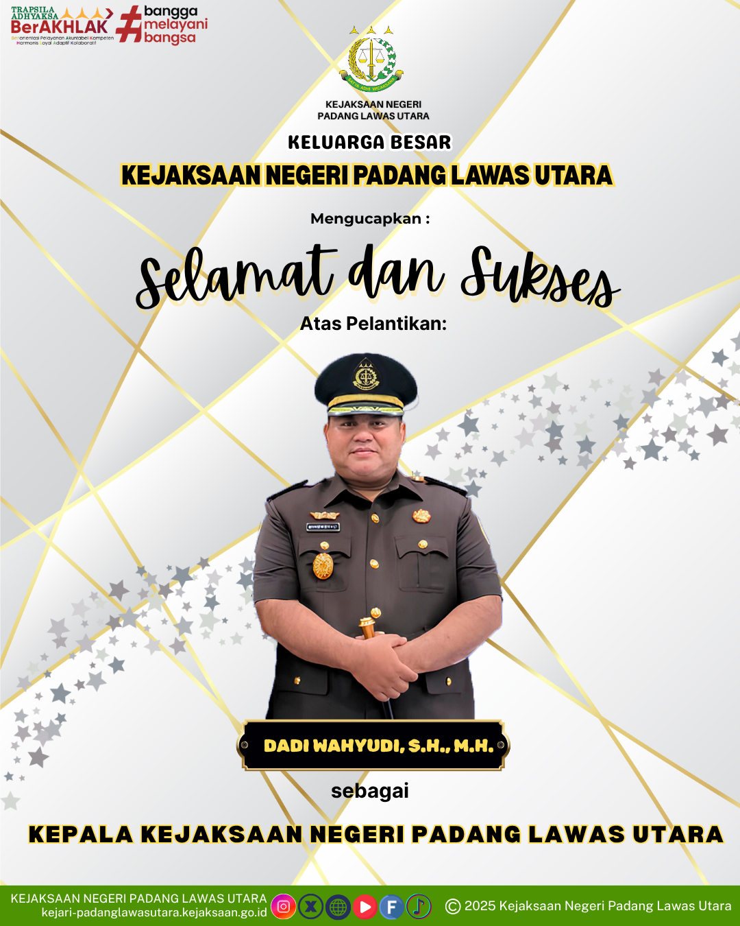Keluarga Besar Kejaksaan Negeri Padang Lawas Utara mengucapkan Selamat & Sukses Atas Dilantiknya Bapak Dadi Wahyudi, S.H., M.H. sebagai Kepala Kejaksaan Negeri Padang Lawas Utara.