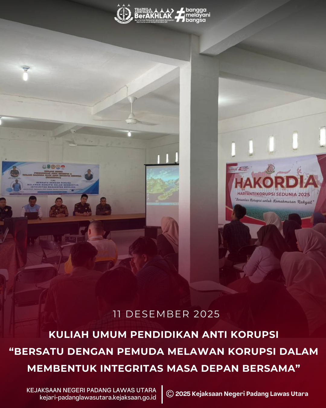 Kamis, 11 Desember 2025, bertempat di Aula Institut Teknologi Dan Sains Padang Lawas Utara, Kejaksaan Negeri Padang Lawas Utara menghadiri Kuliah Umum Pendidikan Anti Korupsi Dalam Rangka Hari Anti Korupsi Sedunia (Hakordia) Tahun 2025 dengan tema bersatu dengan pemuda melawan korupsi dalam membentuk integritas masa depan bersama.