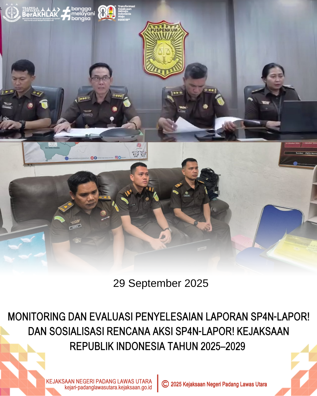 Senin, 29 September 2025 pada pukul 09.00 WIB s/d selesai, telah dilaksanakan kegiatan Monitoring dan Evaluasi Penyelesaian Laporan SP4N-LAPOR! yang Tindak Lanjutnya Masih Berstatus Proses dan Sosialisasi Rencana Aksi SP4N-LAPOR! Kejaksaan R.I. Tahun 2025-2029 bertempat diruang kerja bidang Intelijen Kejaksaan Negeri Padang Lawas Utara.