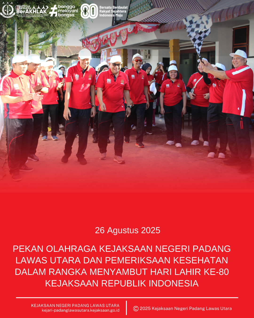 Pada Hari Selasa, 26 Agustus 2025 bertempat di Halaman Kantor Kejaksaan Negeri Padang Lawas Utara, telah dilaksanakan Pekan Olahraga dan Pemeriksaan Kesehatan pada Kejaksaan Negeri Padang Lawas Utara dalam rangka menyambut Hari Lahir Ke-80 Kejaksaan Republik Indonesia yang diikuti oleh Kepala Kejaksaan Negeri Padang Lawas Utara, Bapak Dadi Wahyudi, S.H., M.H. beserta Jajaran dan Ketua Ikatan Adhyaksa Dharmakarini (IAD) Daerah Padang Lawas Utara, Ny. Faradilla Dadi beserta Anggota.
