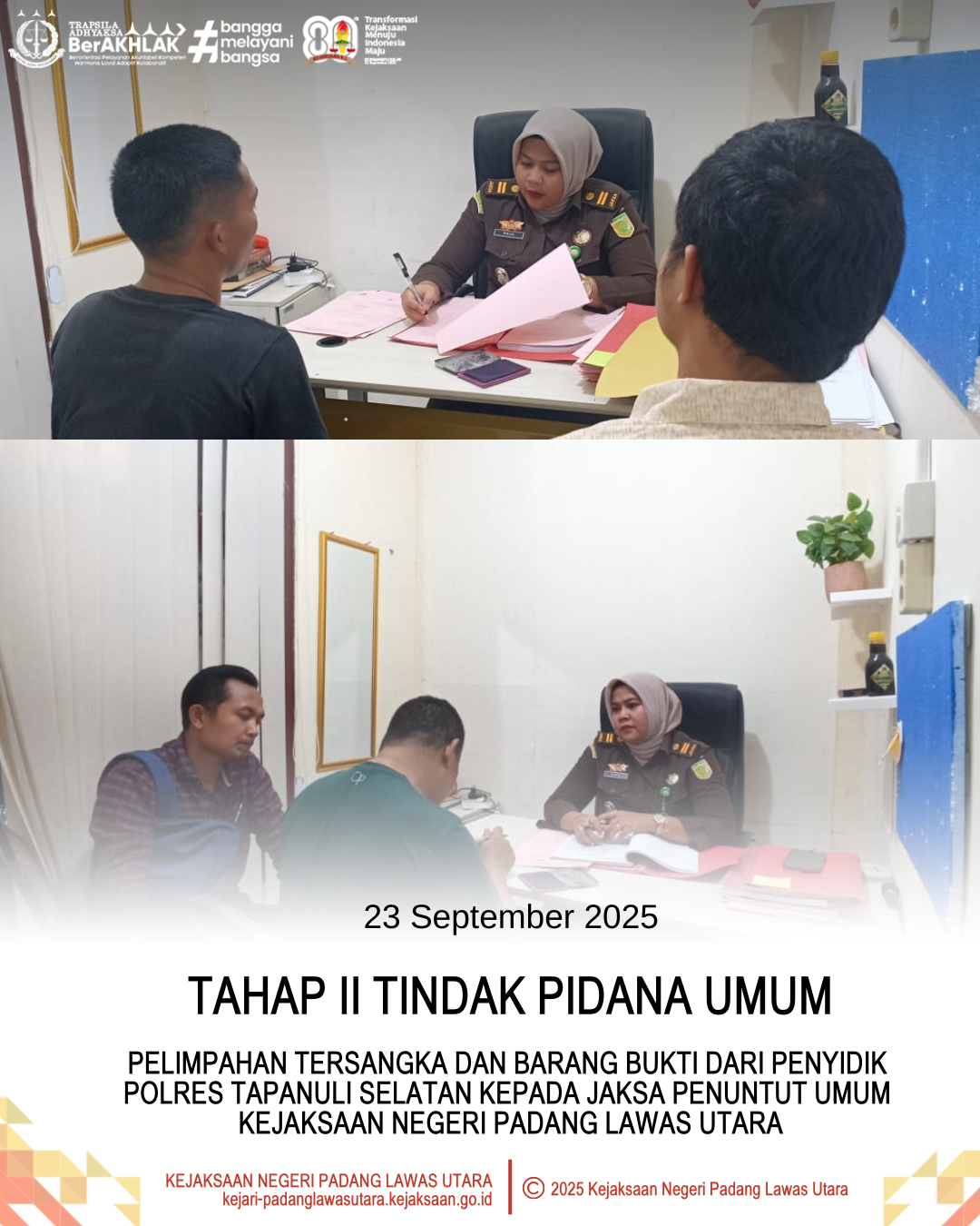 Selasa, 23 September 2025 bertempat di Kantor Kejaksaan Negeri Padang Lawas Utara telah dilaksanakan Tahap II (Penyerahan Tersangka dan Barang Bukti) dari Penyidik Polres Tapanuli Selatan kepada Jaksa Penuntut Umum, Ibu Puja Santi Br Tarigan, S.H.