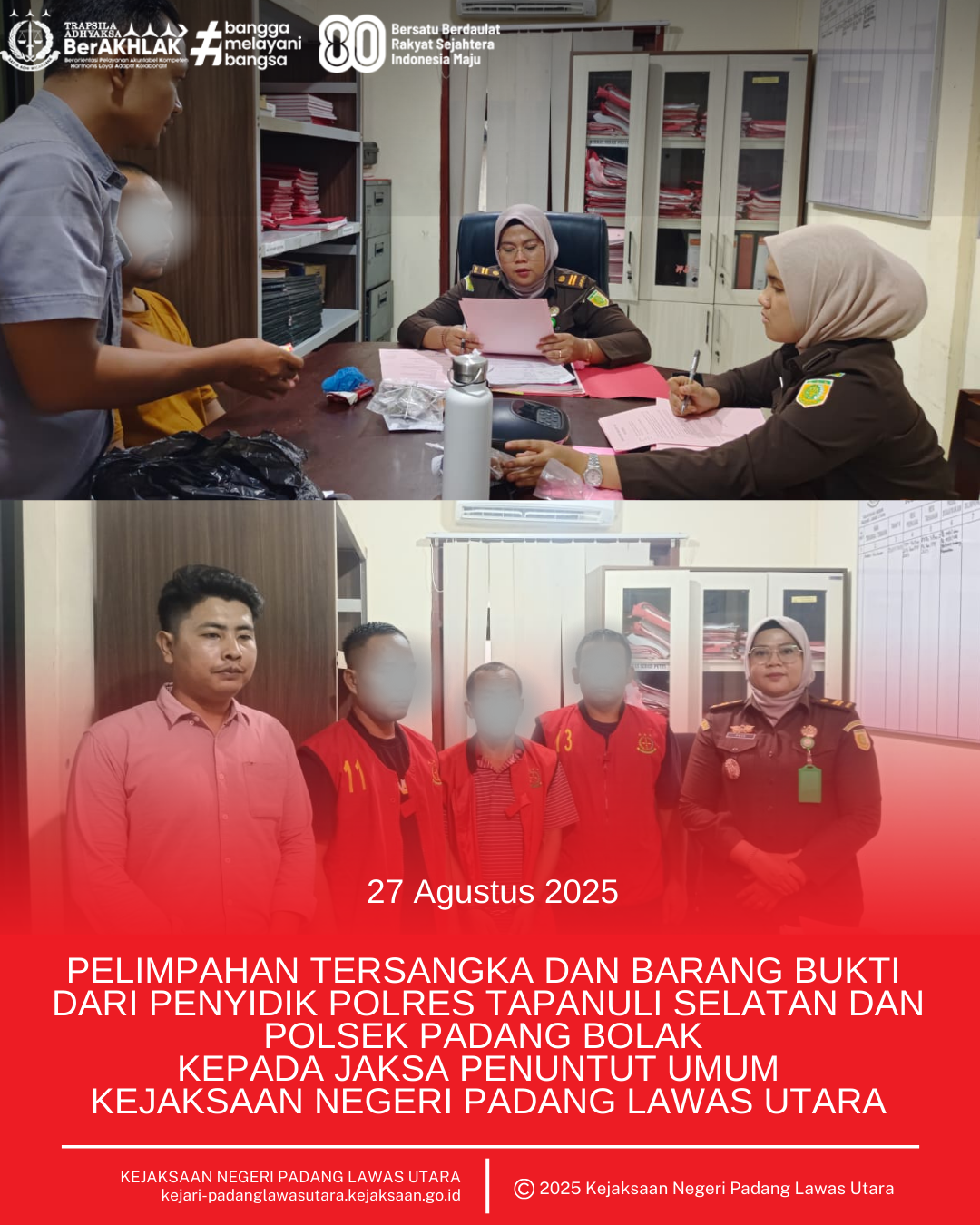 Rabu, 27 Agustus 2025 bertempat di Kantor Kejaksaan Negeri Padang Lawas Utara telah dilaksanakan Tahap II (Penyerahan Tersangka dan Barang Bukti) dari Penyidik Polres Tapanuli Selatan dan Polsek Padang Bolak kepada Jaksa Penuntut Umum, Ibu Puja Santi Br. Tarigan, S.H.