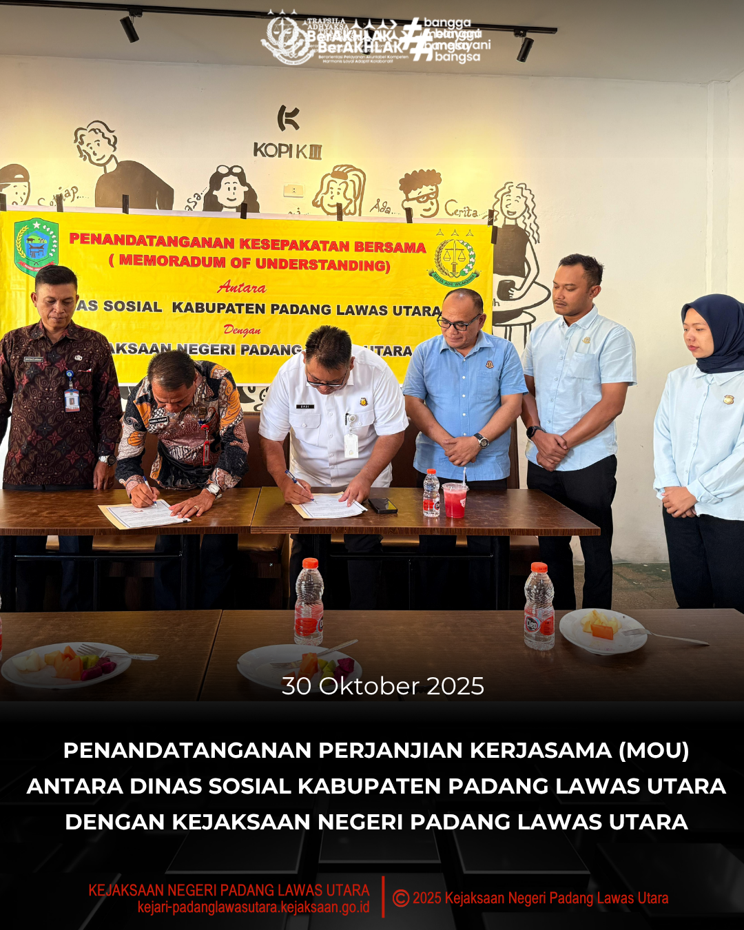 Kamis, 03 Oktober 2025 bertempat di Ruang Rapat Kafe Keluarga, telah dilaksanakan Penandatanganan Perjanjian Kerjasama (MoU) antara Dinas Sosial Kabupaten Padang Lawas Utara dengan Kejaksaan Negeri Padang Lawas Utara.
