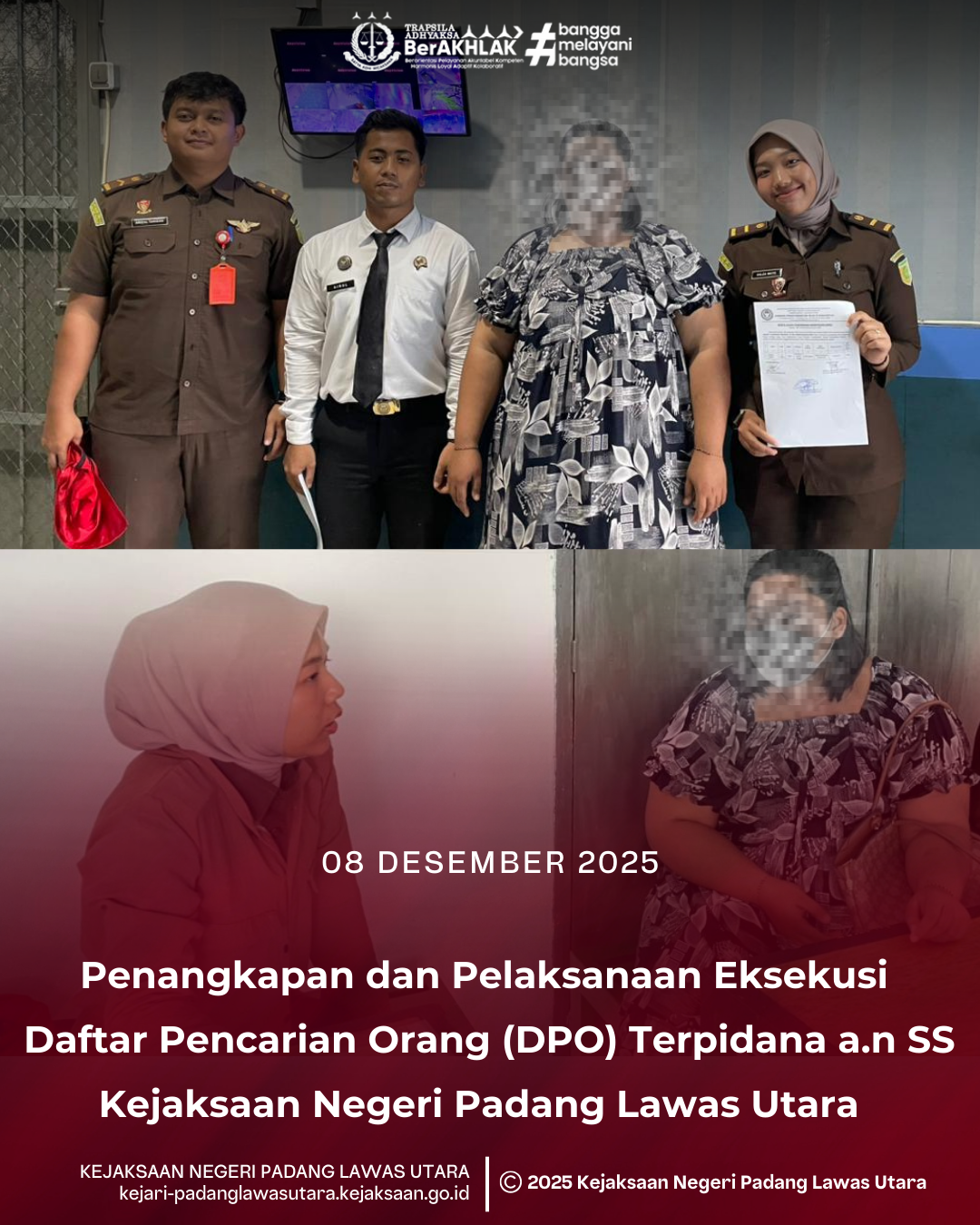 Senin, 08 Desember 2025 sekira pukul 12.00 WIB, yang bertempat di Lembaga Pemasyarakatan (Lapas) Kelas III Gunung Tua, telah dilaksanakan Penangkapan dan Pelaksanaan Eksekusi salah satu dari Daftar Pencarian Orang (DPO) Kejaksaan Negeri Padang Lawas Utara yaitu Terpidana a.n SS oleh Tim Tindak Pidana Umum Kejaksaan Negeri Padang Lawas Utara.