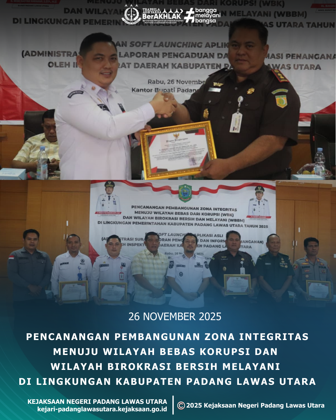 Rabu, 26 November 2025 sekira pukul 09.00 WIB di Kantor Bupati Padang Lawas Utara, Kepala Kejaksaan Negeri Padang Lawas Utara, Bapak Dadi Wahyudi, S.H., M.H. dan Kepala Seksi Intelijen Kejaksaan Negeri Padang Lawas Utara Bapak Erwin Efendi Rangkuti, S.H menghadiri kegiatan Pencanangan Pembangunan Zona Integritas Menuju Wilayah Bebas Korupsi dan Wilayah Birokrasi Bersih Melayani di Lingkungan Kabupaten Padang Lawas Utara bersama dengan Bupati Padang Lawas Utara, Bapak H. Reski Basyah Harahap, S.STP., M.Si., Sekertaris Daerah Kabupaten Padang Lawas Utara Bapak Dr. Patuan Rahmat Syukur P Hasibuan, S.STP.,MM, serta para tamu undangan lainnya.