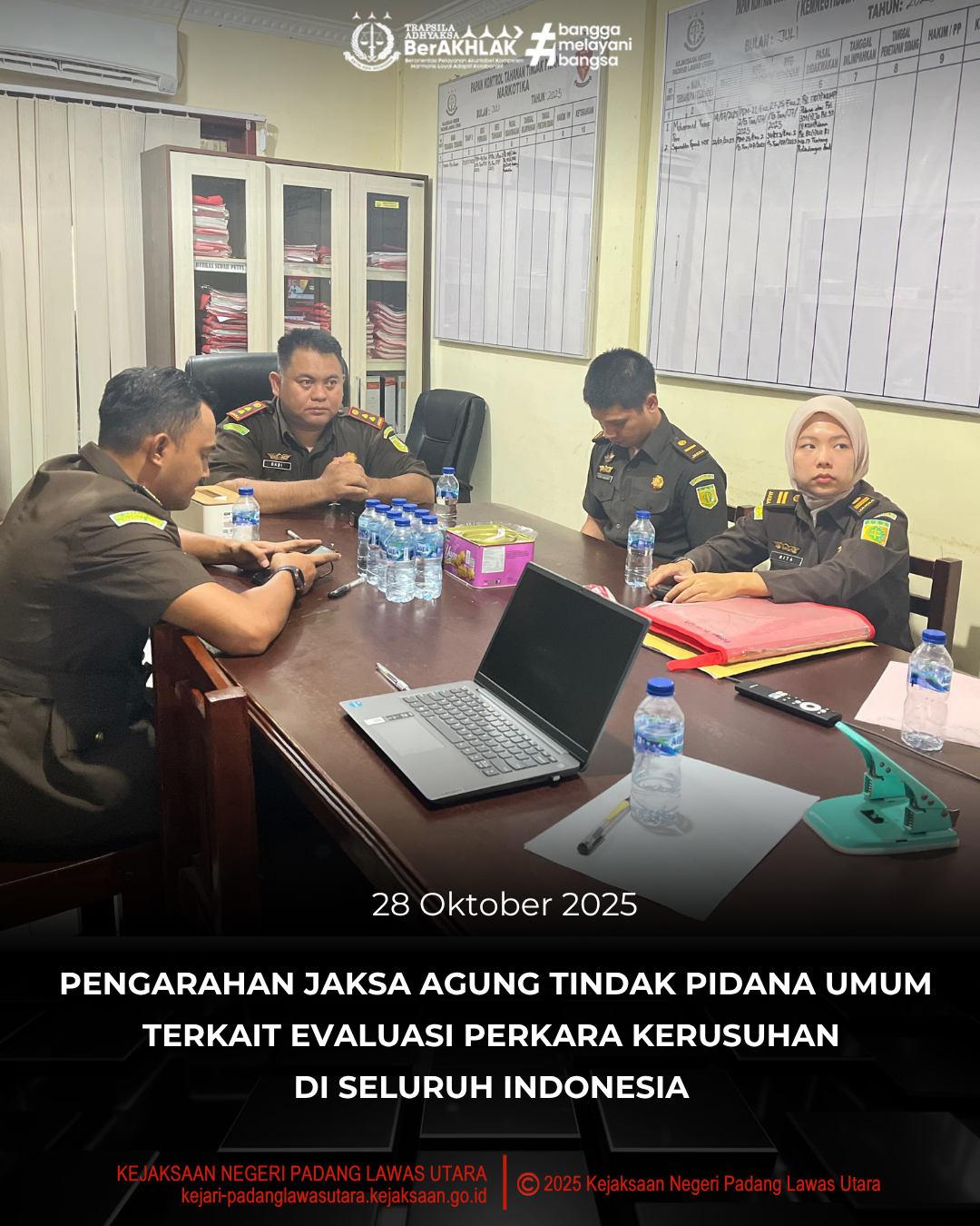 Pada hari Selasa, tanggal 28 Oktober 2025, pada pukul 14.00 WIB s.d selesai, bertempat di Ruang Sidang Tindak Pidana Umum Kejaksaan Negeri Padang Lawas Utara, telah dilaksanakan Pengarahan Jaksa Agung Tindak Pidana Umum terkait Evaluasi Perkara Kerusuhan di Seluruh Indonesia secara daring melalui Aplikasi Zoom Meeting.
