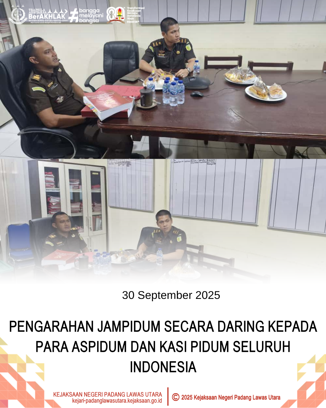 Selasa, 30 September 2025 sekira pukul 09.00 WIB s/d selesai, bertempat di Kantor Kejaksaan Negeri Padang Rapat online terbatas para Aspidum didampingi para Kasi di Pidum dan Para Kasi Pidum se Indonesia secara daring melalui Zoom Meeting.