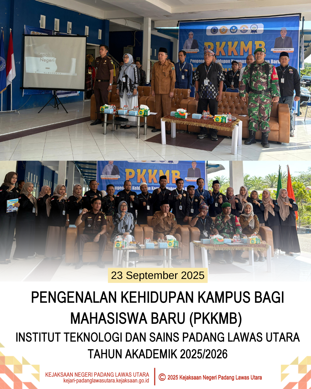 Kepala Kejaksaan Negeri Padang Lawas Utara, Bapak Dadi Wahyudi, S.H., M.H. yang diwakili oleh Kepala Sub Bagian Pembinaan, Bapak Herman Ronald Mauritz Panjaitan, S.H., M.H. menghadiri kegiatan Pengenalan Kehidupan Kampus bagi Mahasiswa Baru (PKKMB) Institut Teknologi dan Sains Padang Lawas Utara Tahun Akademik 2025/2026 sekaligus menjadi Narasumber pada kegiatan tersebut dengan membawakan materi tentang “Pendidikan anti korupsi