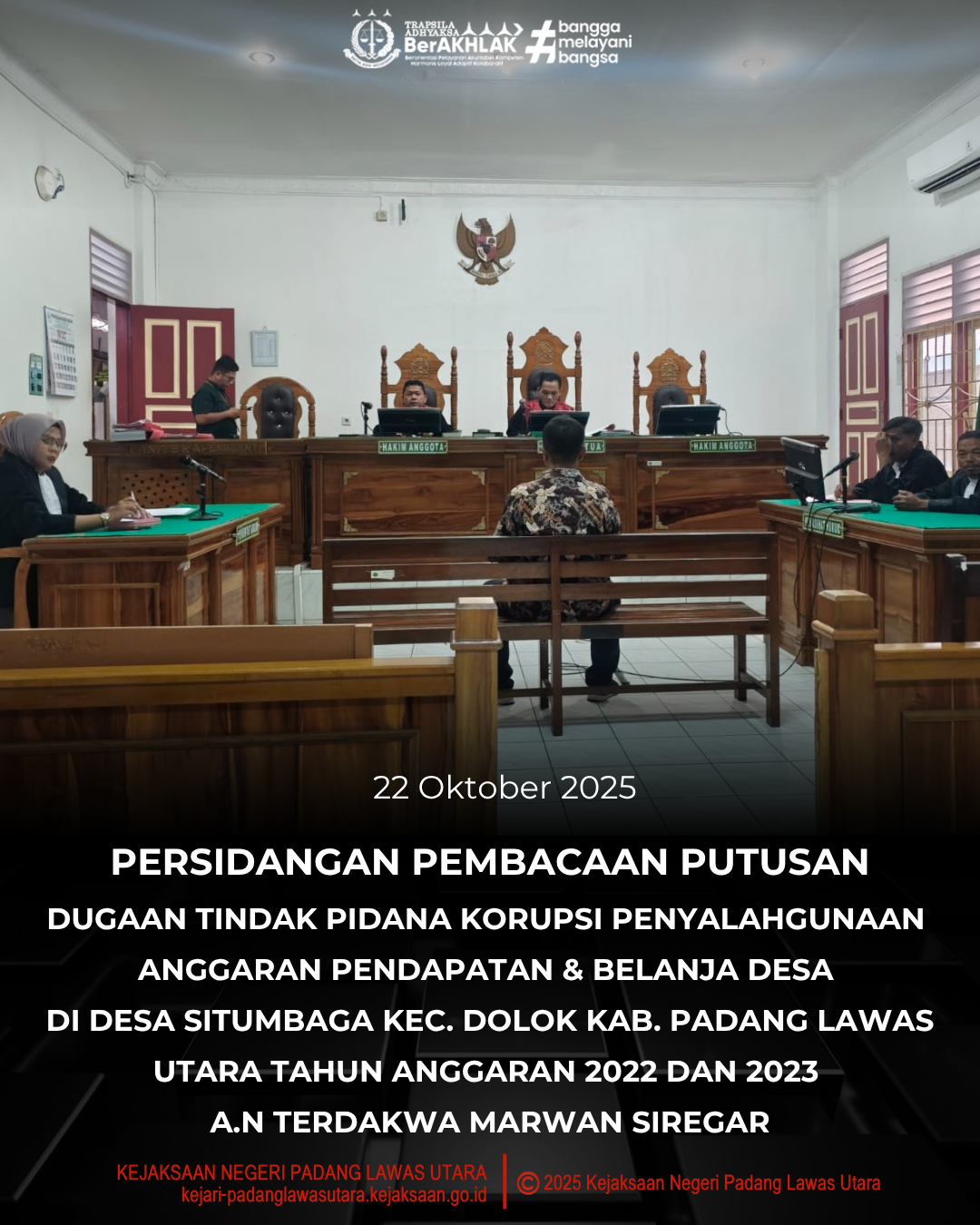 bertempat di Pengadilan Negeri Tipikor Medan, Jaksa Penuntut Umum pada Kejaksaan Negeri Padang Lawas Utara, Ibu Puja Santi Br. Tarigan, S.H. mengikuti persidangan tindak pidana korupsi atas Perkara Dugaan Tindak Pidana Korupsi Penyalahgunaan Anggaran Pendapatan dan Belanja Desa di Desa Situmbaga, Kecamatan Dolok, Kabupaten Padang Lawas Utara Tahun Anggaran 2022 dan 2023 An. Terdakwa Marwan Siregar dengan agenda Pembacaan Putusan.