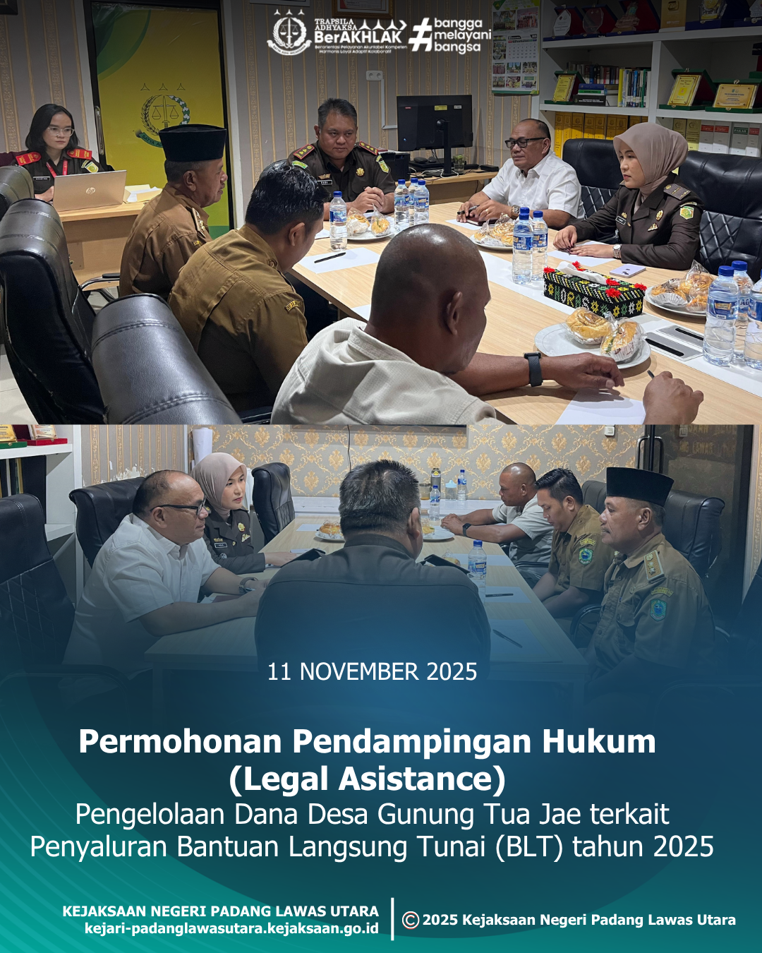 Selasa, 11 November 2025 bertempat di Ruang Kerja Seksi Perdata dan TUN Kejaksaan Negeri Padang Lawas Utara, telah dilaksanakan kegiatan Permohonan Pendampingan Hukum (Legal Asistance) terhadap Pengelolaan Dana Desa Gunung Tua Jae terkait Penyaluran Bantuan Langsung Tunai (BLT) tahun 2025.