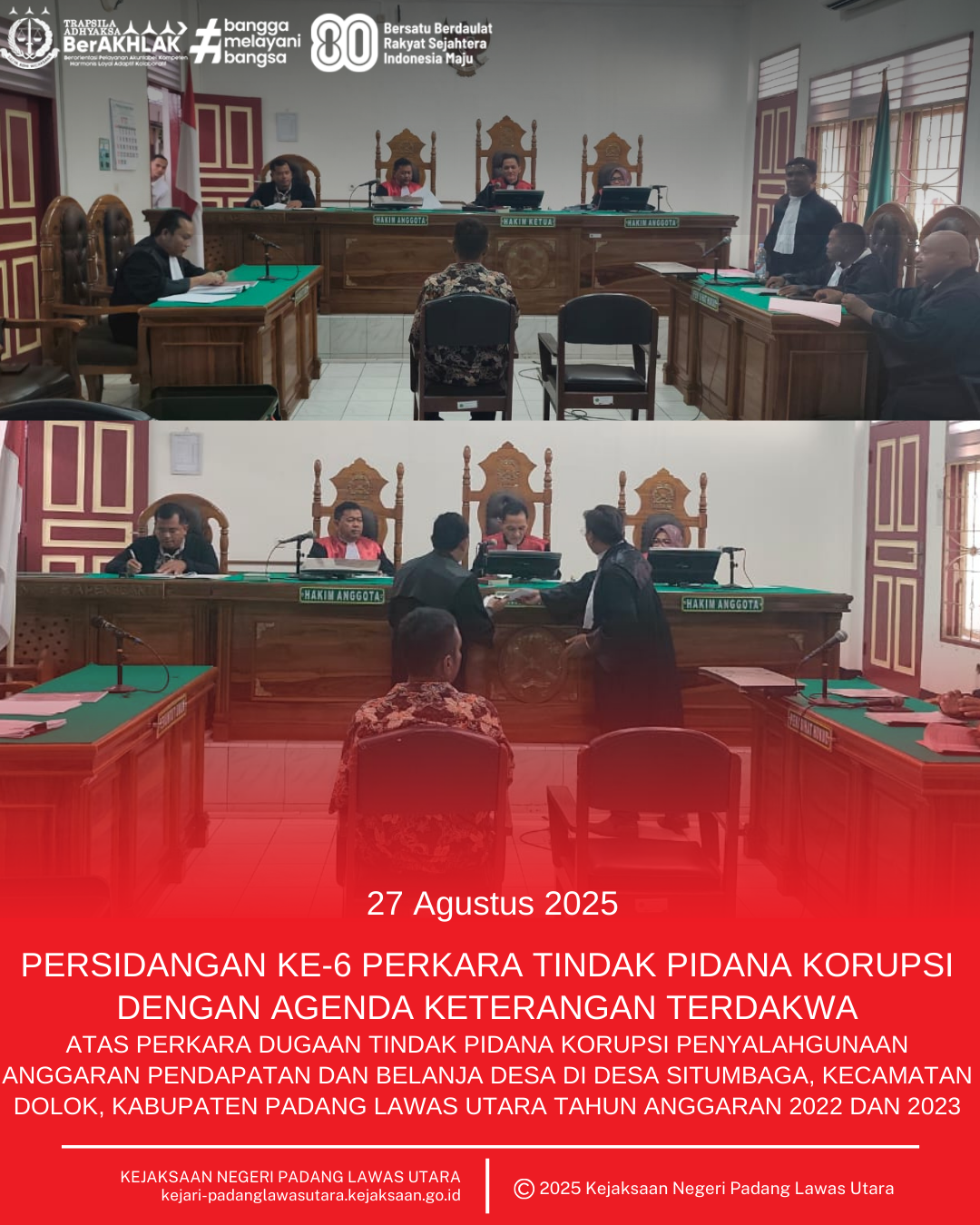 Rabu, 27 Agustus 2025 bertempat di Pengadilan Negeri Tipikor Medan, telah dilaksanakan Persidangan Keenam atas Perkara Dugaan Tindak Pidana Korupsi Penyalahgunaan Anggaran Pendapatan dan Belanja Desa di Desa Situmbaga, Kecamatan Dolok, Kabupaten Padang Lawas Utara Tahun Anggaran 2022 dan 2023 An. Terdakwa Marwan Siregar dengan agenda Keterangan Terdakwa.