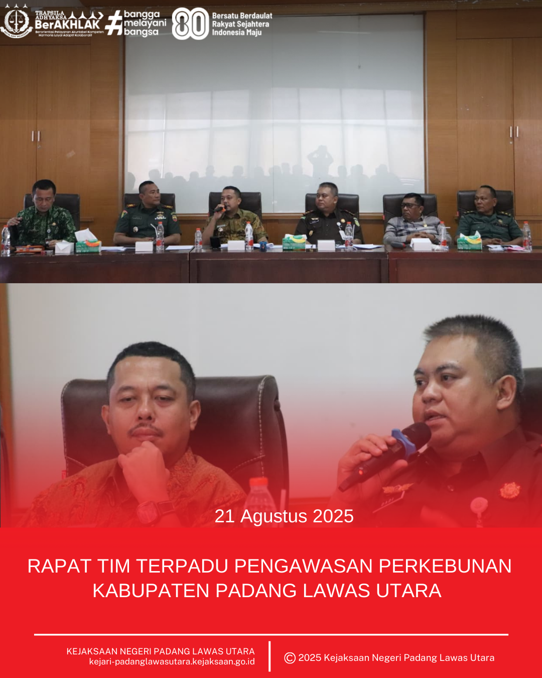 Kamis, 21 Agustus 2025 Kepala Kejaksaan Negeri Padang Lawas Utara, Bapak Dadi Wahyudi, S.H., M.H., didampingi oleh Kepala Seksi Intelijen, Bapak Erwin Efendi Rangkuti S.H., serta Kepala Seksi Perdata dan Tata Usaha Negara, Bapak Jan Maswan Sinurat, S.H., menghadiri Rapat Tim Terpadu Pengawasan Perkebunan Kabupaten Padang Lawas Utara yang bertempat di Aula Rapat Bupati, Lt. 2 Kantor Bupati Padang Lawas Utara.