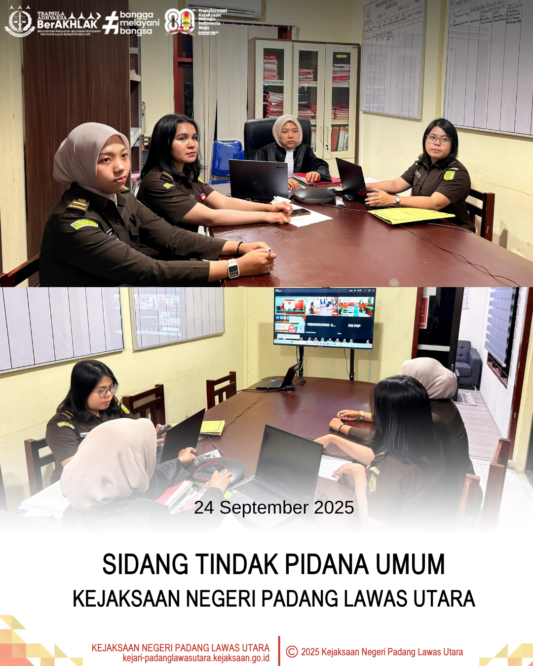 Rabu, 24 September 2025 bertempat di Ruangan Sidang Tindak Pidana Umum Kantor Kejaksaan Negeri Padang Lawas Utara, Telah dilaksanakan Sidang Perkara Tindak Pidana Umum secara online melalui aplikasi zoom terhadap 12 (Dua Belas) terdakwa dengan beberapa acara seperti Acara Tuntutan, Pledoi, Saksi A De Charge, Putusan, dan Saksi Verbalisan.