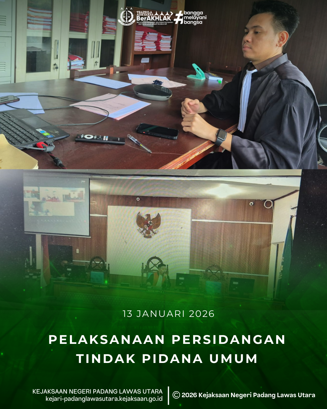 Selasa, 13 Januari 2026, bertempat di Ruang Persidangan Seksi Tindak Pidana Umum Kejaksaan Negeri Padang Lawas Utara telah dilaksanakan persidangan perkara tindak pidana umum secara daring terhadap 4 (Empat) terdakwa dengan agenda Tuntutan dan Saksi.