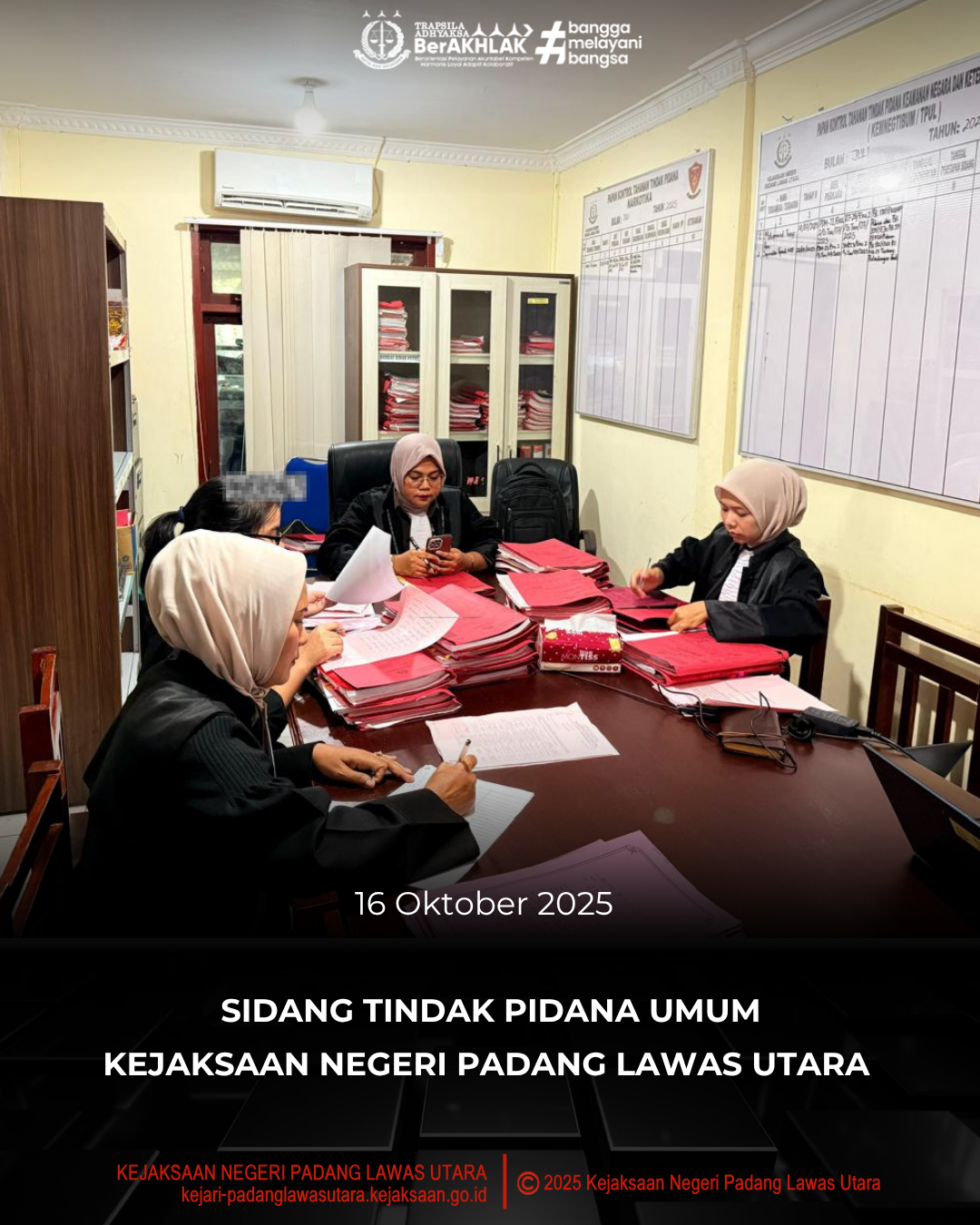 Kamis, 16 Oktober 2025 bertempat di Ruang Sidang Tindak Pidana Umum Kantor Kejaksaan Negeri Padang Lawas Utara, telah dilaksanakan Sidang Perkara Tindak Pidana Umum secara online melalui aplikasi zoom terhadap 31 (Tiga Puluh Satu) terdakwa dengan beberapa acara seperti sidang pertama, saksi, tuntutan, saksi a de charge, putusan, pledoi dan terdakwa.
