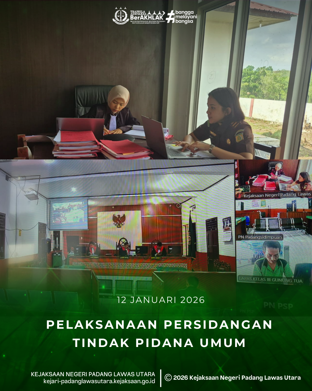 Senin, 12 Januari 2026, bertempat di Ruang Persidangan Seksi Tindak Pidana Umum Kejaksaan Negeri Padang Lawas Utara telah dilaksanakan persidangan perkara tindak pidana umum secara daring terhadap 8 (Delapan) terdakwa dengan agenda Dakwaan, Putusan, Replik, dan Tuntutan.