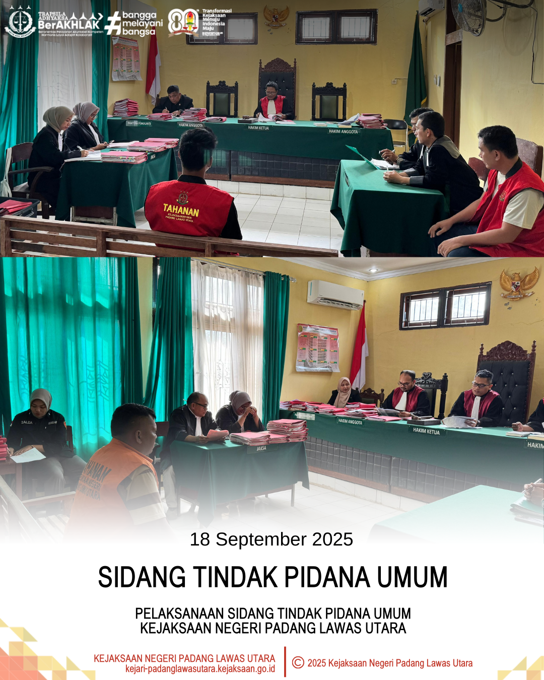 Kamis, 18 September 2025 sekira pukul 14.00 WIB s/d selesai bertempat di Zitting Plaats Pengadilan Negeri Padangsidimpuan yang beralamat di Jalan Ki Hajar Dewantara, Lk. VII Pasar Gunung Tua, Kecamatan Padang Bolak, Kabupaten Padang Lawas Utara, telah dilaksanakan Persidangan di luar Gedung Persidangan (Zitting Plaats) pada Kejaksaan Negeri Padang Lawas Utara. Adapun acara persidangan yaitu Putusan, Tuntutan, Saksi, Terdakwa, Saksi A De Charge, Pledoi, Dakwaan, dan Tanggapan JPU.