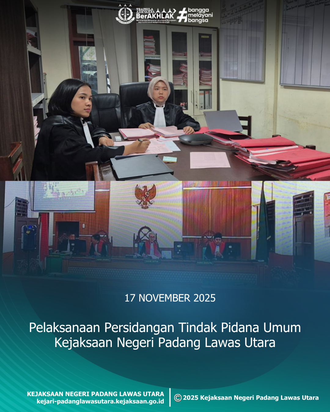 Senin, 17 November 2025, bertempat di Ruang Persidangan Seksi Tindak Pidana Umum Kejaksaan Negeri Padang Lawas Utara telah dilaksanakan persidangan perkara tindak pidana umum secara daring terhadap 20 (dua puluh) terdakwa dengan agenda Pembacaan Dakwaan, Saksi, Pembacaan Tuntutan dan Replik.
