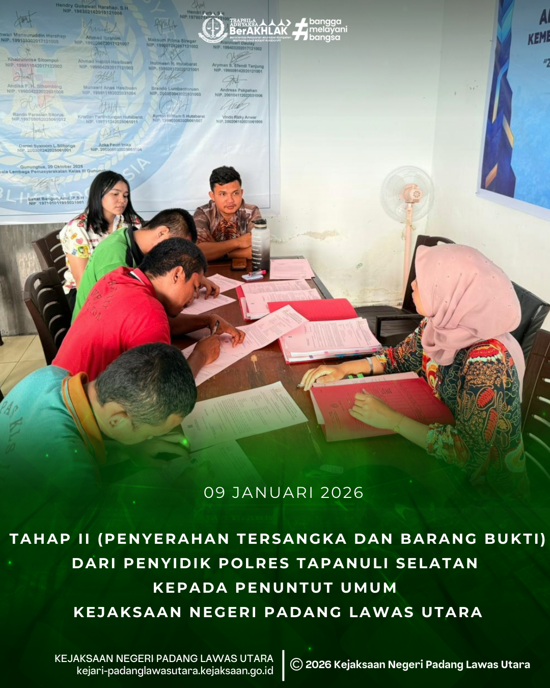 Jum'at, 09 Januari 2026, bertempat di Kantor Kejaksaan Negeri Padang Lawas Utara pada seksi Tindak Pidana Umum, telah dilaksanakan Tahap II (Penyerahan Tersangka dan Barang Bukti) dari Penyidik Polres Tapanuli Selatan kepada Penuntut Umum Kejaksaan Negeri Padang Lawas Utara, Ibu Yunita Pasaribu, S.H terhadap 3 (tiga) terdakwa.