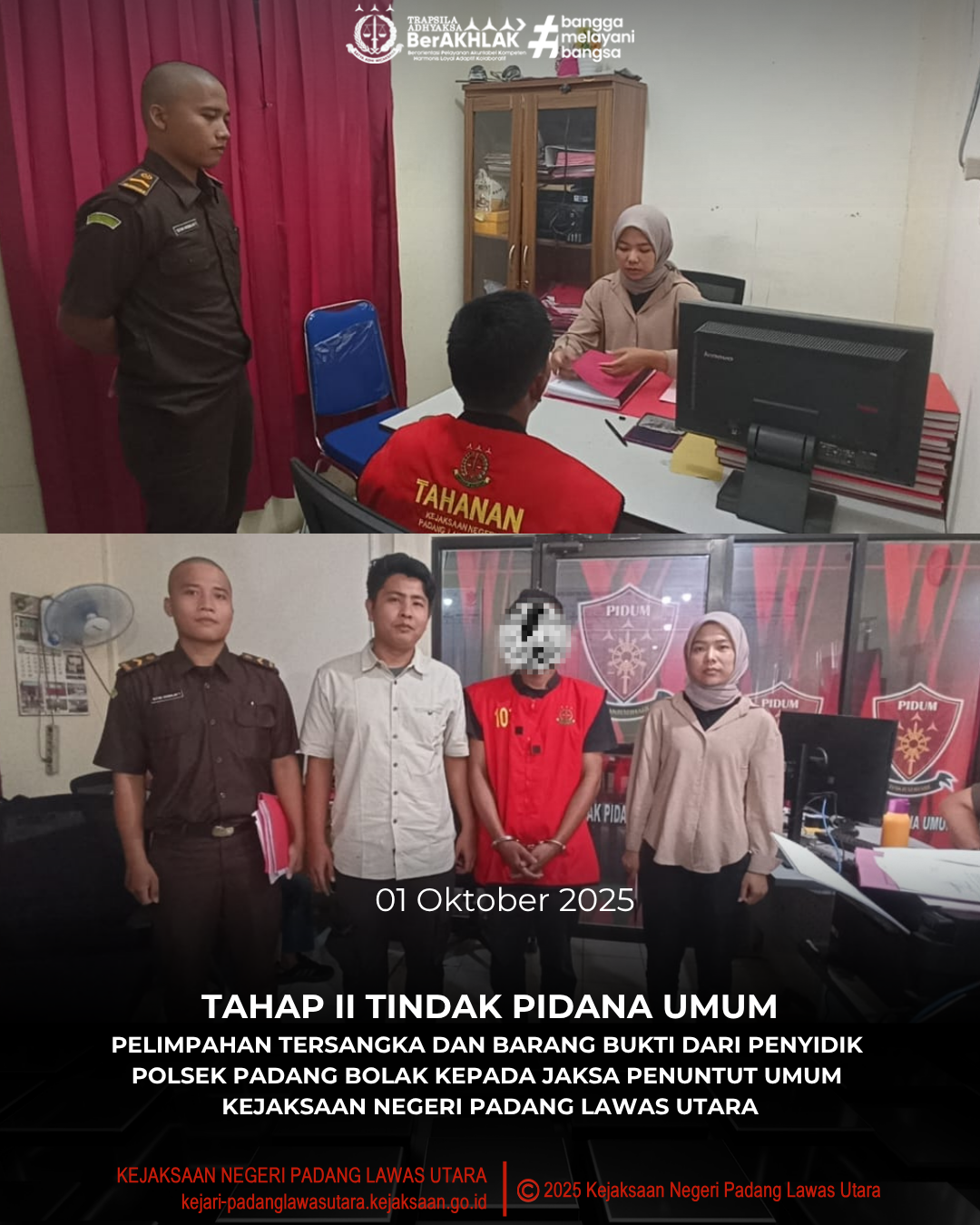 Rabu, 01 Oktober 2025 bertempat di Kantor Kejaksaan Negeri Padang Lawas Utara telah dilaksanakan Tahap II (Penyerahan Tersangka dan Barang Bukti) dari Penyidik Polsek Padang Bolak kepada Jaksa Penuntut Umum, Ibu Yunita Pasaribu, S.H.