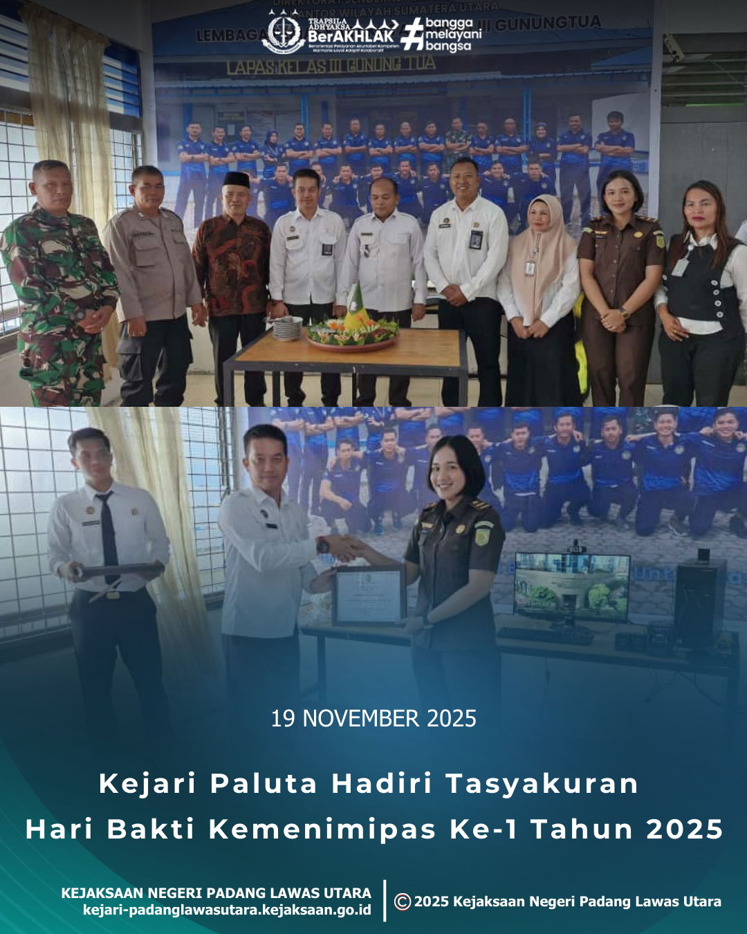 Rabu, 19 November 2025 sekira pukul 09.30 WIB di Lembaga Pemasyarakatan Kelas III Gunungtua, Bapak Dadi Wahyudi, S.H., M.H selaku Kepala Kejaksaan Negeri Padang Lawas Utara yang diwakili oleh Ibu Delila TM Sihotang, S.H., selaku Jaksa Fungsional menghadiri acara Tasyakuran Hari Bakti Kementrian Imigrasi dan Pemasyarakatan ke-I Tahun 2025.