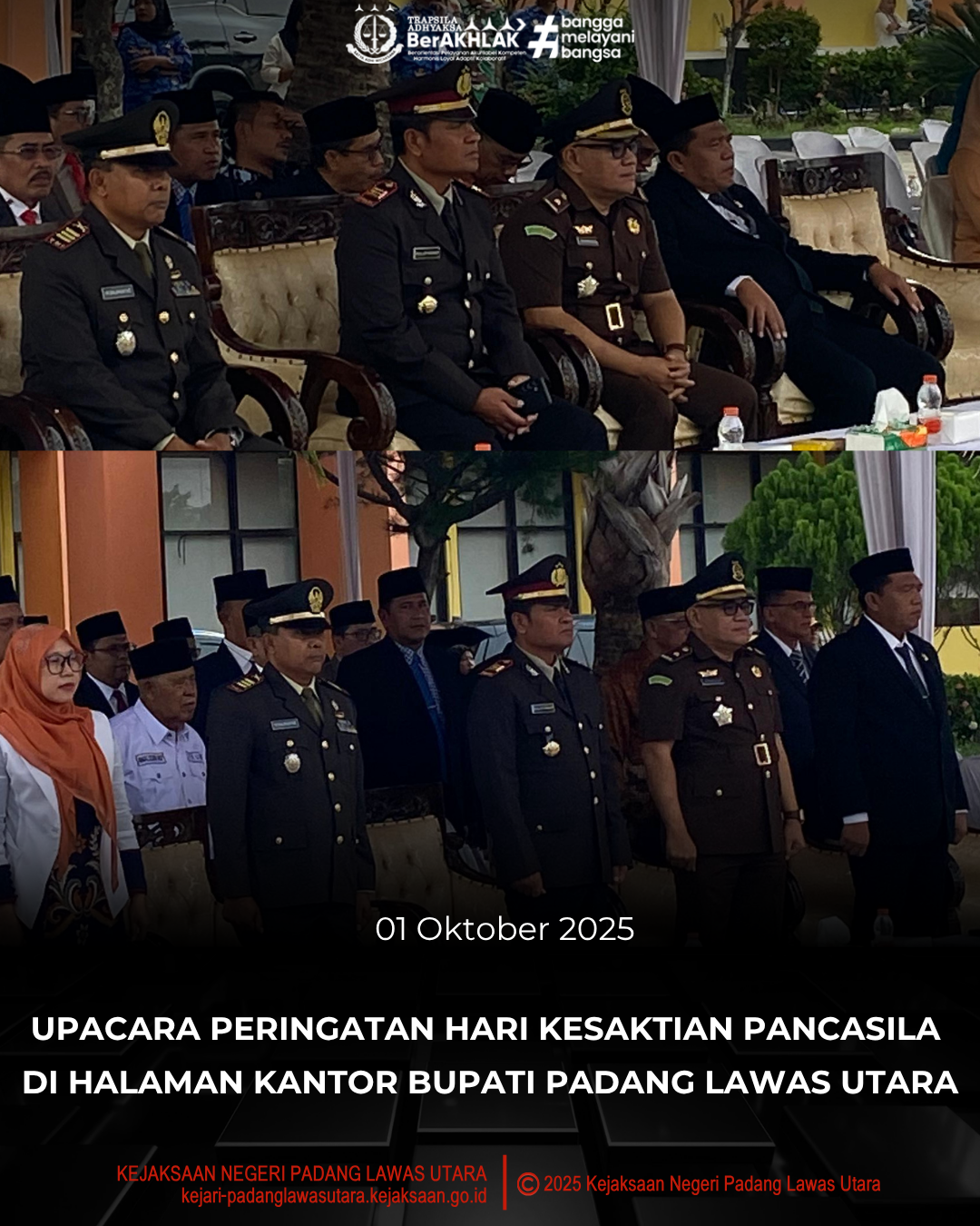 Rabu, 01 Oktober 2025 sekira pukul 07.30 WIB, Kepala Kejaksaan Negeri Padang Lawas Utara, Bapak Dadi Wahyudi, S.H., M.H. yang diwakili oleh Bapak Jan Maswan Sinurat, S.H. selaku Kepala Seksi Perdata dan TUN beserta Ketua Ikatan Adhyaksa Dharmakarini Daerah Padang Lawas Utara, Ny. Faradilla Dadi yang diwakili oleh Ny. Yasmin Erwin selaku Ketua Bidang Ekonomi, mengikuti Upacara Peringatan Hari Kesaktian Pancasila di Halaman Kantor Bupati Padang Lawas Utara.