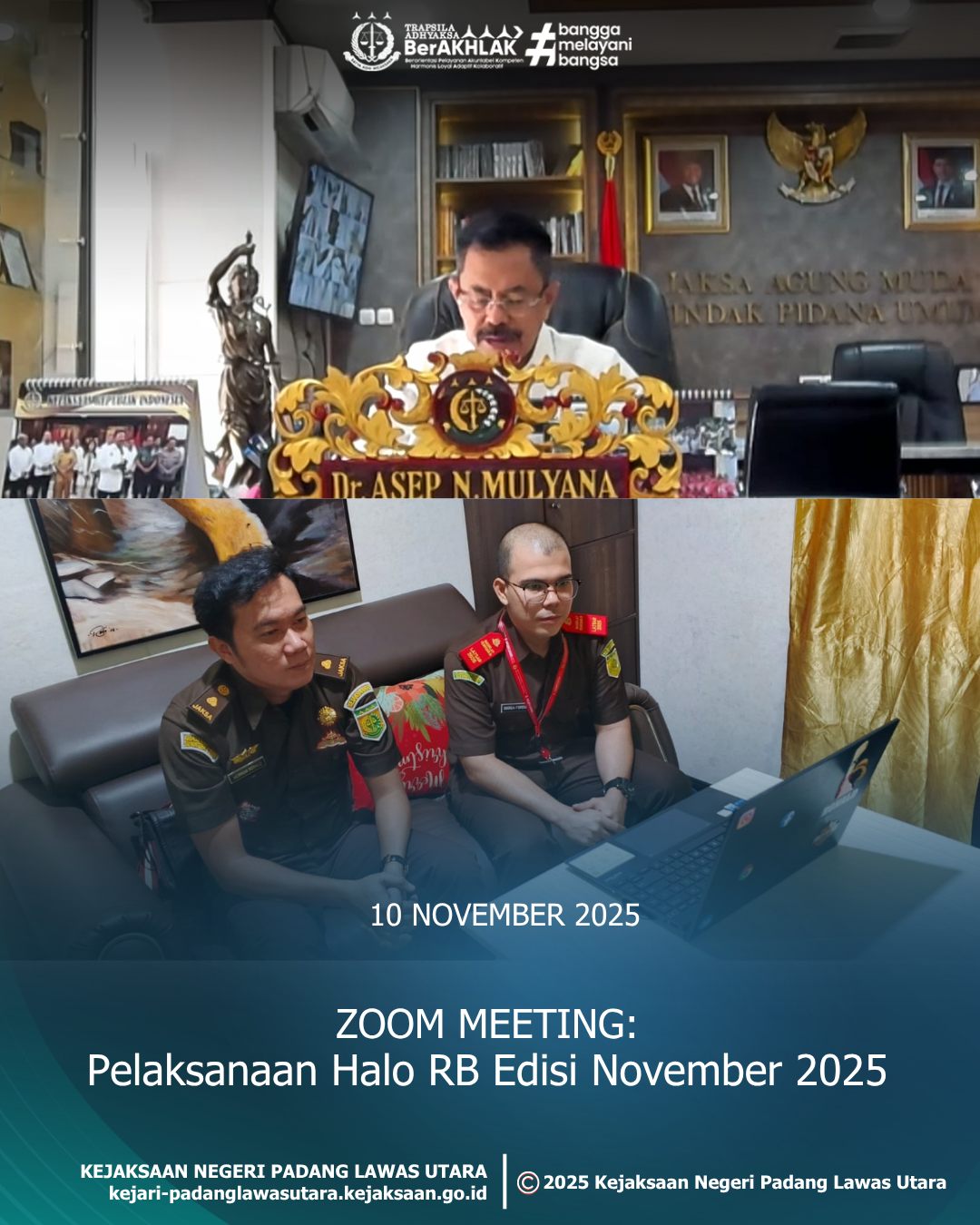 Senin, 10 November 2025 sekira pukul 10.00 Wib s/d selesai, bertempat di Ruangan Bidang Pembinaan dilaksanakan Zoom Meeting Pelaksanaan Halo RB periode November Tahun 2025 yang diikuti oleh Kepala Sub Bagian Pembinaan Kejaksaan Negeri Padang Lawas Utara Bapak Herman Ronald Mauritz Panjaitan, S.H., M.H dan Staf Bidang Pembinaan.