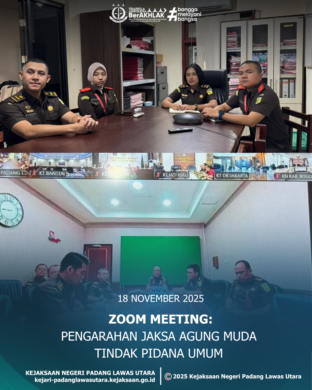 Selasa, 18 November 2025 sekira pukul 09.00 WIB di Ruang Seksi Tindak Pidana Umum, Bapak Dadi Wahyudi, S.H., M.H selaku Kepala Kejaksaan Negeri Padang Lawas Utara dan Bapak Juanda Fadli, S.H., M.H selaku Kepala Seksi Pidana Umum yang diwakili oleh Yusuf Ildovito Simanjuntak, S.H dan Delila TM Sihotang, S.H., selaku Jaksa Fungsional serta staf Seksi Tindak Pidana Umum Kejaksaan Negeri Padang Lawas Utara mengikuti Zoom Meeting Pengarahan JAMPIDUM dalam rangka perumusan dan penyusunan kodifikasi Pedoman Jaksa Agung Republik Indonesia tentang Penanganan Perkara Tindak Pidana Umum sebagai persiapan implementasi KUHP Nasional.